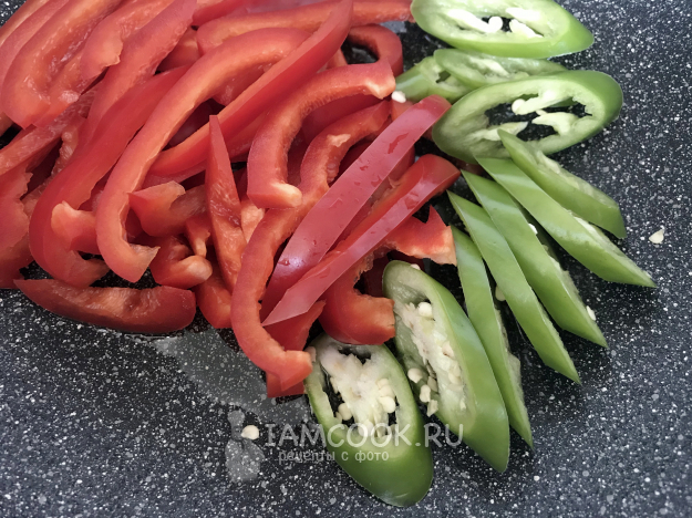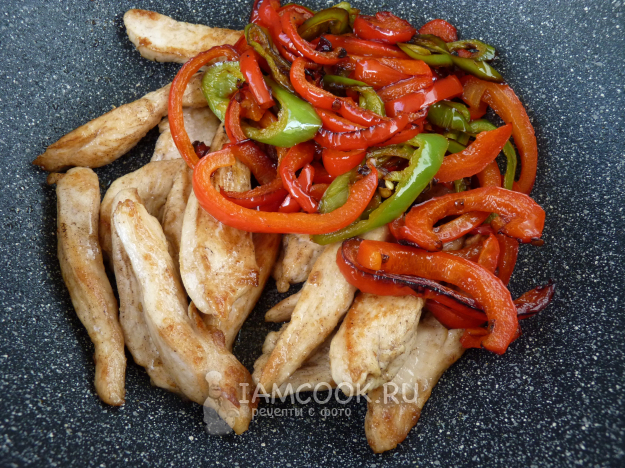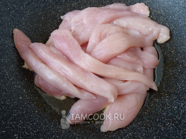 Грудку цыплёнка нарезала на длинные полоски и тоже обжарила на кунжутном масле.
