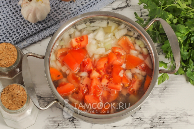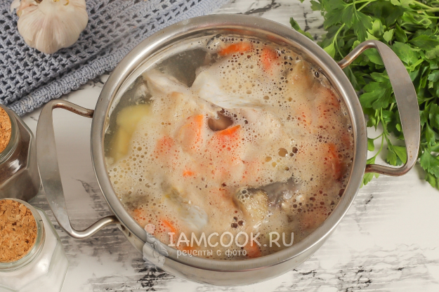На умеренном нагреве доведите всё до кипения и проварите примерно 3-4 минуты. В это время образуется обильная пена - удалите ее с помощью шумовки и отварите всё еще 10 минут.
