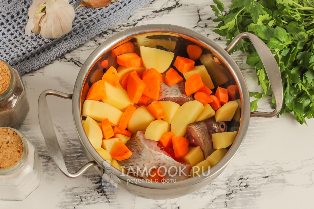 Рыбу разрежьте на части и выложите всё в кастрюлю.