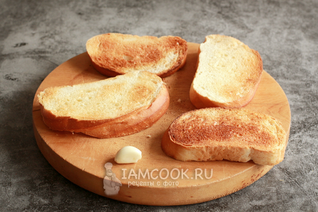 Ломтики мягкого батона подсушите в тостере или на гриле. Для этой цели подойдет и обычная сковорода без масла.