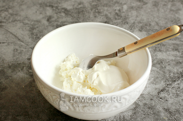Соедините творог со сметаной и перемешайте, можно пробить блендером для более гладкой консистенции, но я этот процесс опустила.