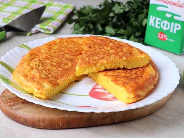 Готовьте пирог с капустой на кефире на сковороде под крышкой примерно 15-20 минут, до тех пор, пока тесто не начнет отделяться от стенок сковороды. Когда поверхность пирога будет нежидкой, накройте плоской тарелкой и переверните сковороду.