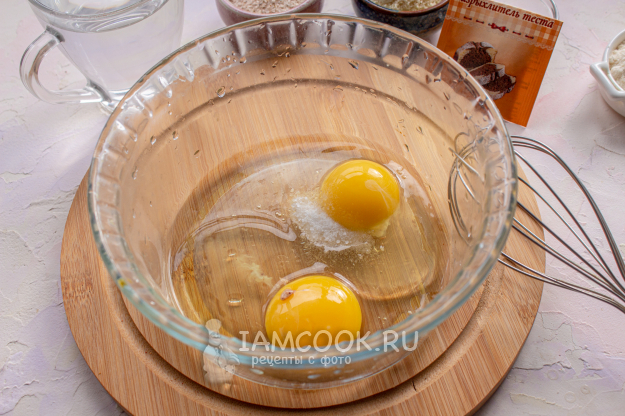 В миске соедините 2 куриных яйца с солью и перемешайте венчиком.