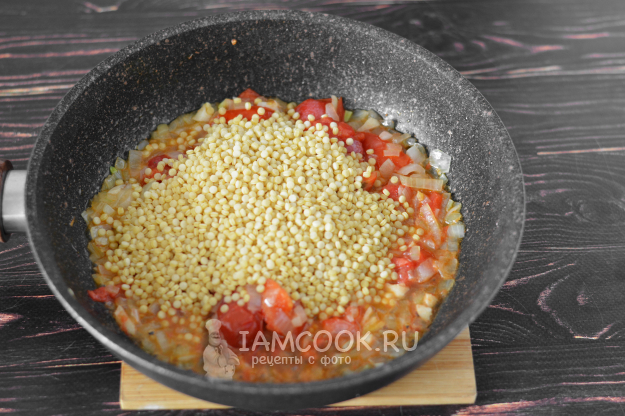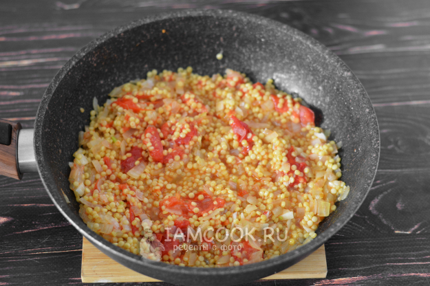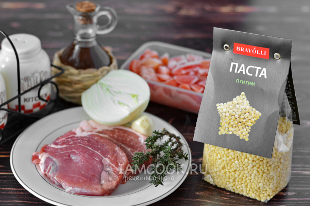 Чтобы приготовить птитим с мясом (свининой), соберите все необходимые продукты по списку. Помидоры у меня замороженные, но можно, конечно, брать свежие.