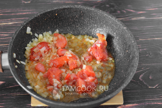 Добавьте нарезанный чеснок и помидоры и обжаривайте всё вместе еще около 3 минут.