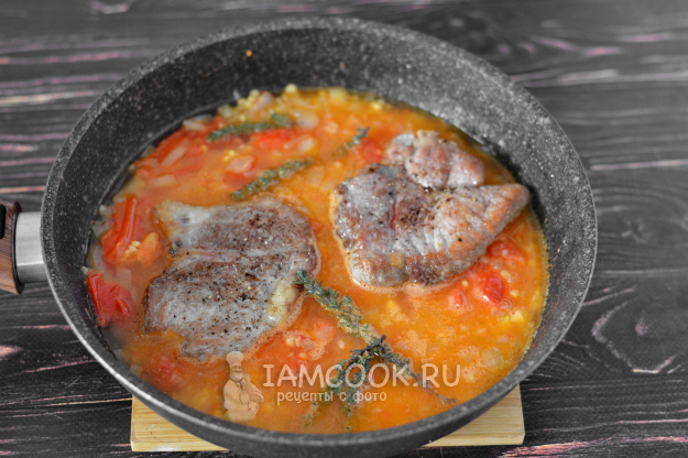 Добавьте соль, веточки тимьяна, верните в сковороду обжаренные куски свинины. Влейте кипяток, накройте крышкой и сделайте умеренный огонь.