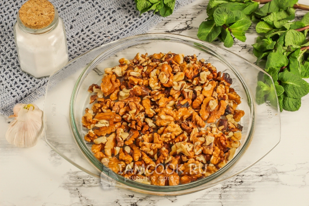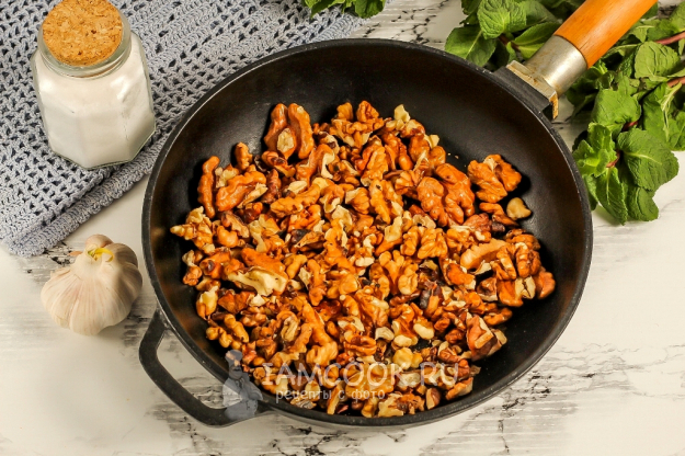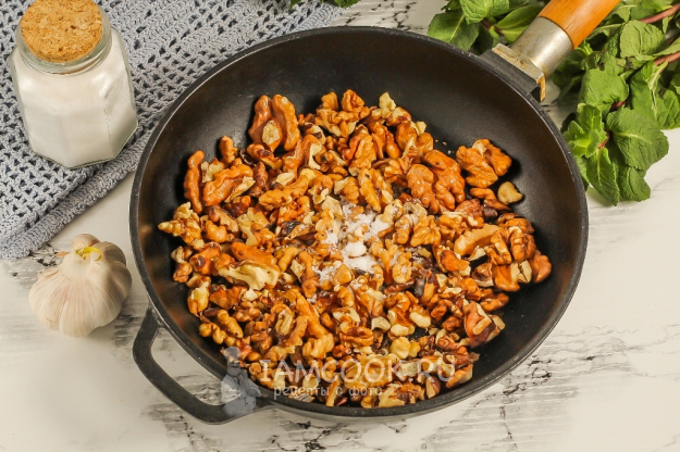 Первый и самый простой вариант - жареные грецкие орехи на сковороде. Для этого вам нужно перебрать ядра, удалить мелкие кусочки скорлупы и перегородок, если они есть. Прогреть сковороду и высыпать орехи на нее. Обжарить примерно 3-5 минут на среднем нагреве помешивая.