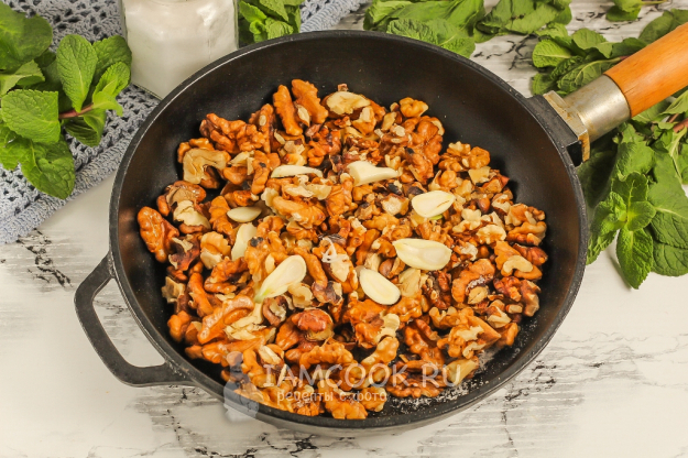 Последний, третий способ для любителей кулинарных экспериментов - жареные грецкие орехи с чесноком! Поджарьте на сухой сковороде ядра в течение 3-4 минут, не забывая помешивать. В это время очистите зубчики чеснока, нарежьте их слайсами и добавьте к орехам. Обжарьте еще 1 минуту и выключите нагрев.