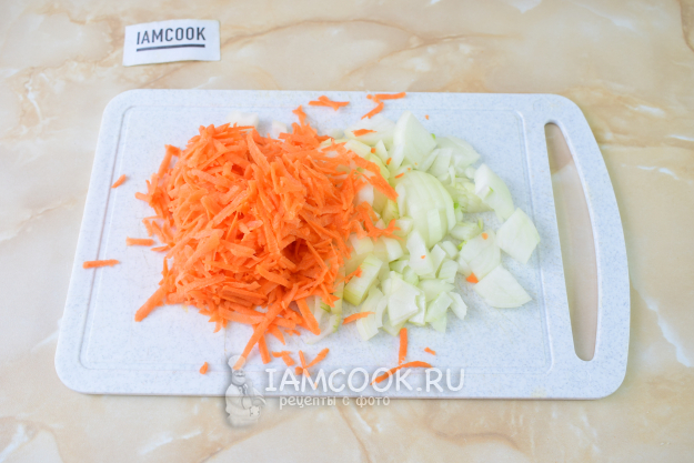 Отдельно очистите лук и морковь. Потрите морковь на терке. Лук мелко нарежьте.