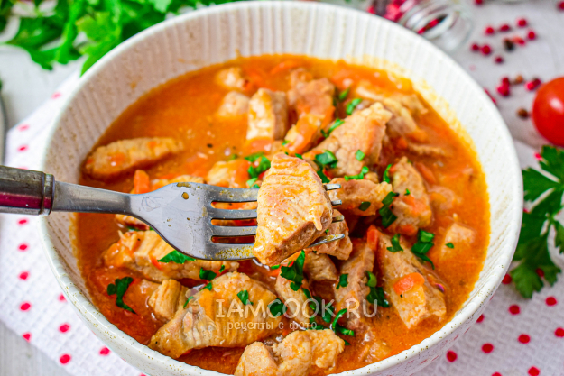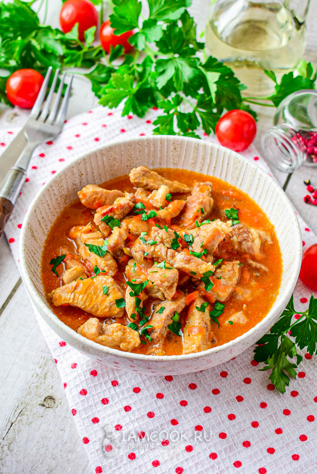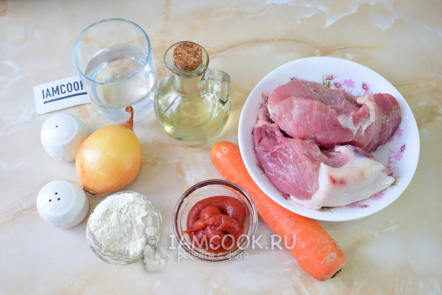 Для приготовления гуляша из свинины с подливкой в мультиварке возьмите все продукты по списку. Мясо берите без костей. Допустимо оставить немного жира, это придаст мясу сочности.