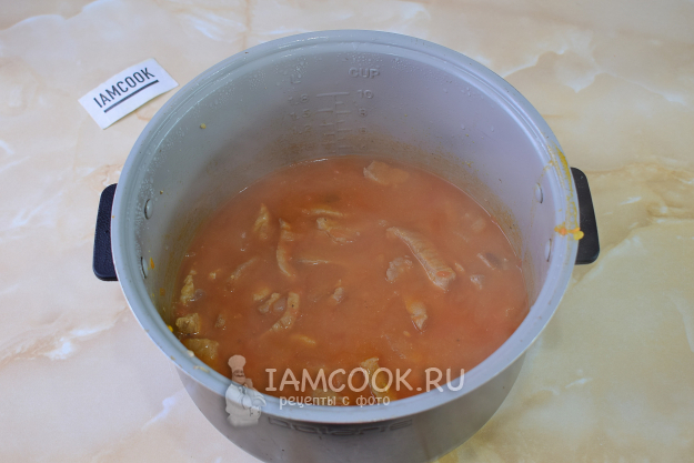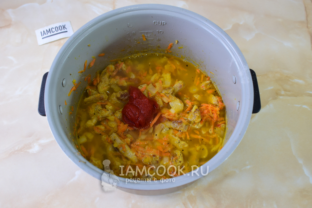 Влейте в чашу горячую воду. Выложите томатную пасту. Добавьте соль и специи. Перемешайте. Закройте мультиварку крышкой. Переключите её на режим "Тушение". Готовьте гуляш из свинины с подливкой в мультиварке 1 час.