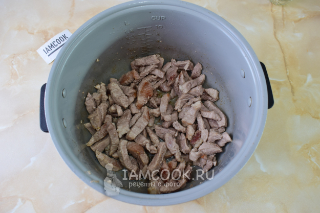 Выбранное мясо можно нарезать любой формы. Я буду резать полосочками. Мультиварку включите на режим "Жарка". Дайте ей разогреться до горячего состояния. Налейте в чашу растительное масло. Затем выложите нарезанное мясо. Мясо будет становиться слегка золотистым.
