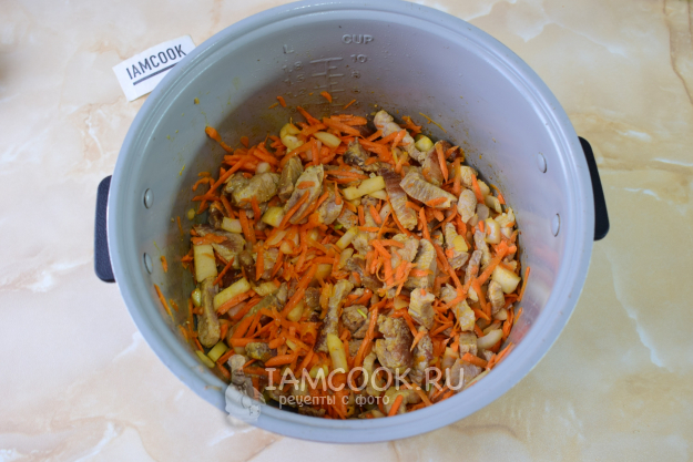 Подготовленные овощи выложите к мясу. Смешайте. Обжаривайте все вместе несколько минут, чтобы овощи стали мягче.