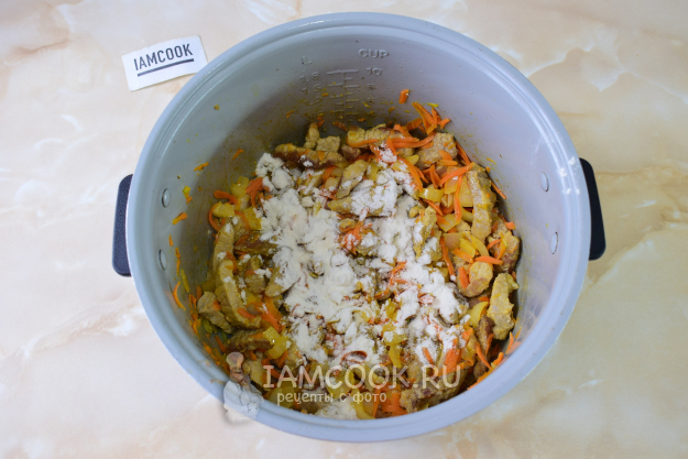 Посыпьте мясо мукой. Перемешайте. Мука сделает гуляш приятно обволакивающим.