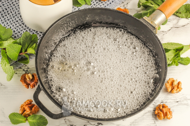 На среднем нагреве доведите сироп до кипения и не забывайте иногда перемешивать. Сначала сироп покроется крупными белыми пузырями - так и должно быть.