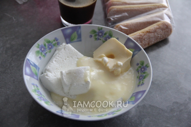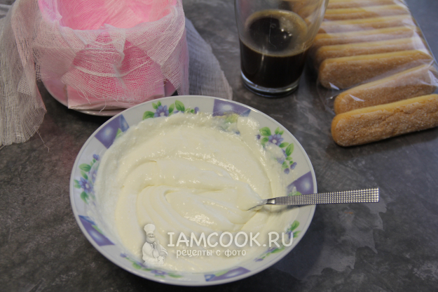 Пробить творожную массу погружным блендером. Масса получится однородной, гладкой и негустой. Кофе развести в теплой воде.