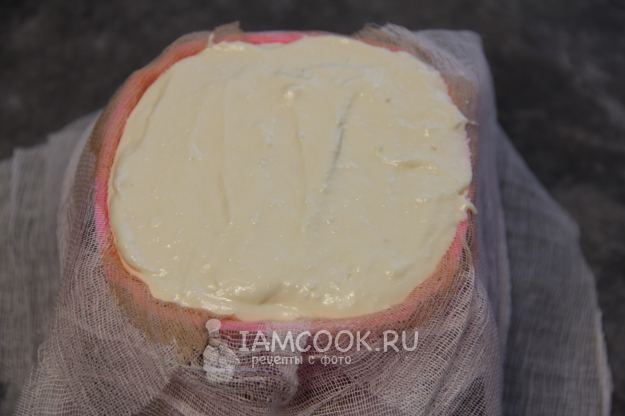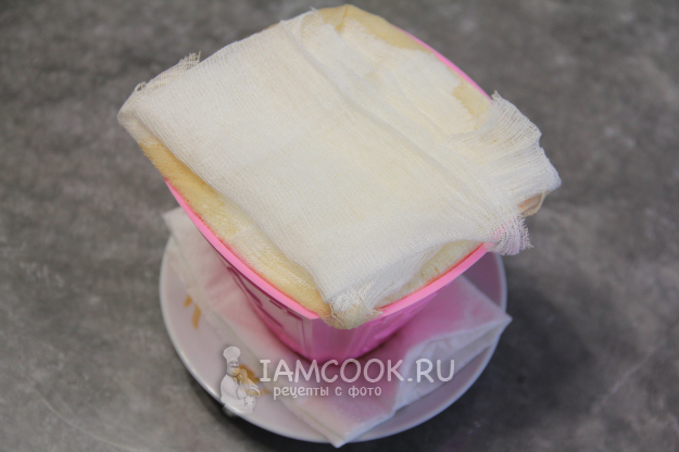 Форму для творожной пасхи выстелить двумя слоями марли. Поставить форму на тарелку, дно которой застелить бумажным полотенцем в несколько слоев. Полотенце будет впитывать влагу из пасхи во время стабилизации. На дно формы выложить пару ложек творожной массы.