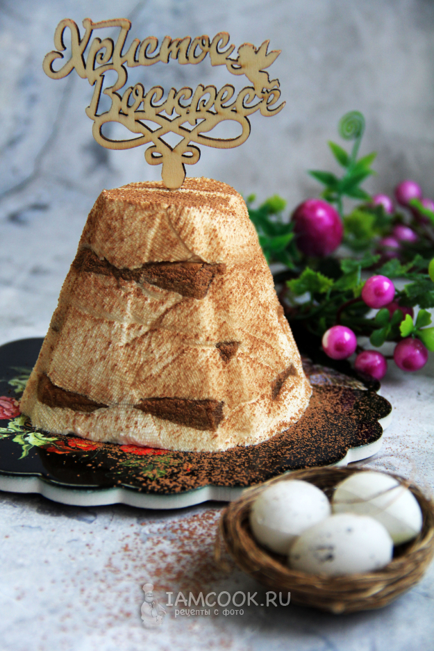 Аккуратно переложить пасху на плоскую тарелку и убрать марлю. Присыпать верх какао. По желанию украсить творожную пасху тирамису топпером.