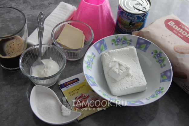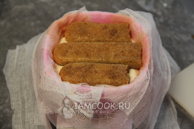 Палочку савоярди разрезать по форме, и окунув в кофе, выложить поверх творожной массы.