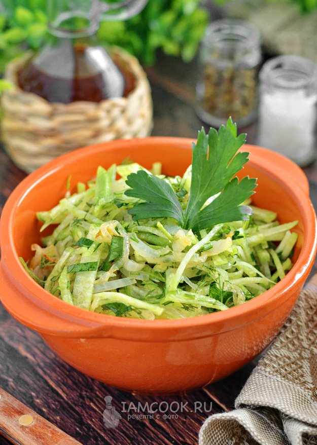 Салат из зелёной редьки с жареным луком готов. Приятного аппетита!