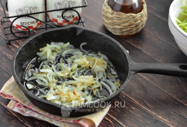 Лук нарежьте полукольцами и обжарьте на разогретом масле до хорошего золотистого цвета. Обжаренный лук полностью остудите.
