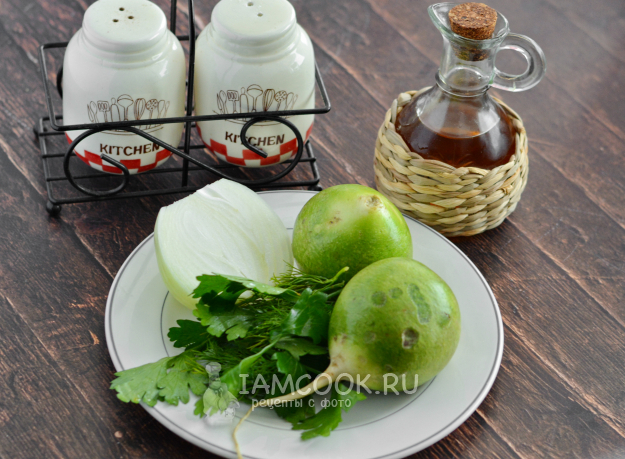 Подготовьте всё по списку для приготовления салата из зелёной редьки с жареным луком.