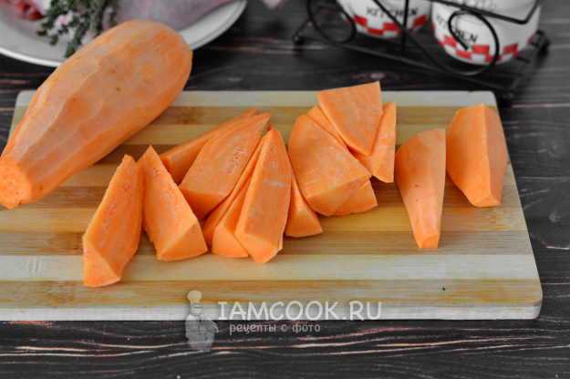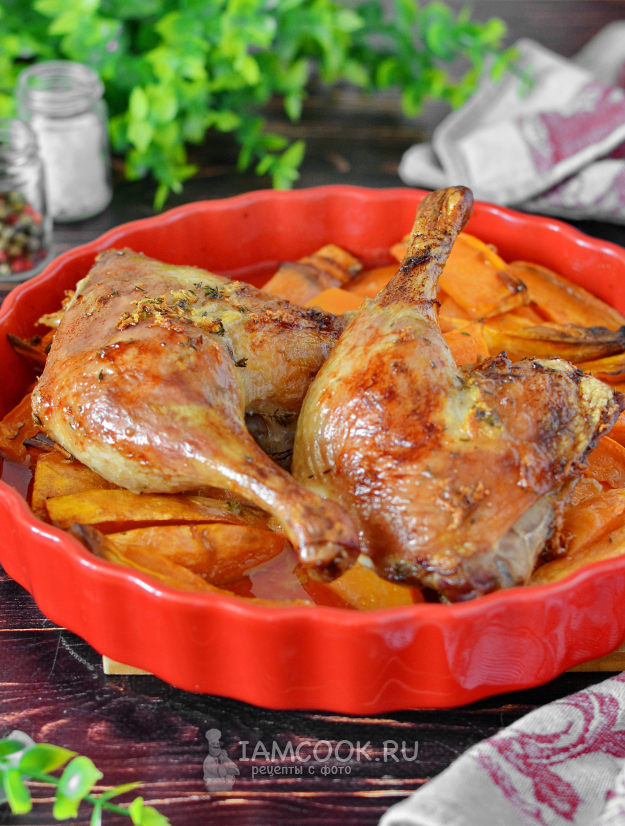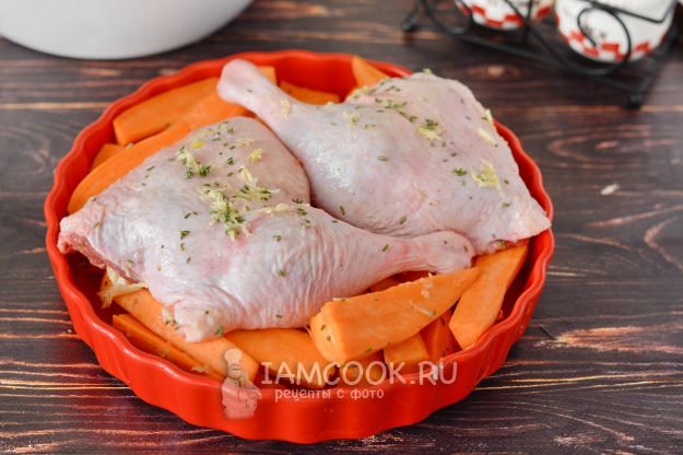 В форму для запекания выложите сначала батат, сверху выложите ножки утки, поставьте в духовку.