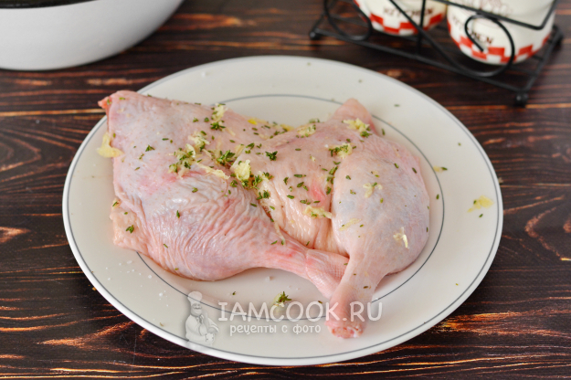 Второй половиной чеснока, тимьяна и соли натрите утиные ножки.