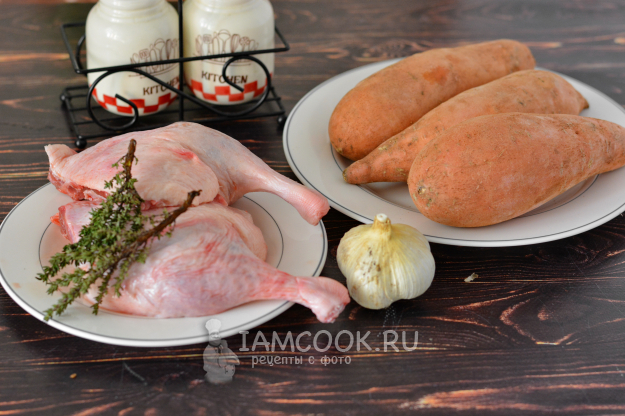 Набор продуктов для приготовления утки с бататом в духовке, в общем-то несложный: утиные ножки, батат, чеснок и тимьян. Для этого блюда не стоит выдумывать сложных маринадов, чтобы не забивать естественный вкус утки и батата, они сами по себе довольно колоритные по вкусу.