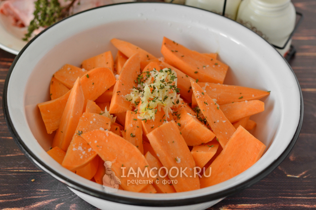 С тимьяна оборвите листочки, чеснок спрессуйте. Половину чеснока и тимьяна добавьте к батату, посолите слегка и перемешайте.
