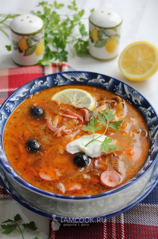 Сборная мясная солянка с капустой, грибами и картошкой готова. При подаче в тарелку добавьте ломтик лимона и сметану.