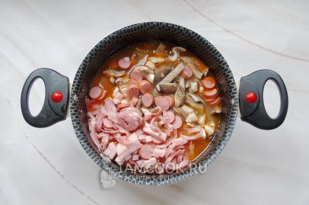 Вешенки помойте, обрежьте толстые корни и нарежьте грибы произвольно. Добавьте в кастрюлю. Выложите нарезанные колбасные изделия.