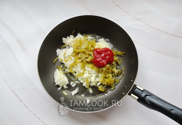 Репчатый лук мелко нарежьте. Соленый огурец натрите на терке или тоже мелко нарежьте. Выложите в сковороду. Добавьте томатную пасту. Налейте подсолнечное масло и 70-80 мл бульона или воды.