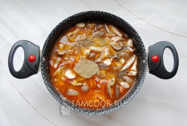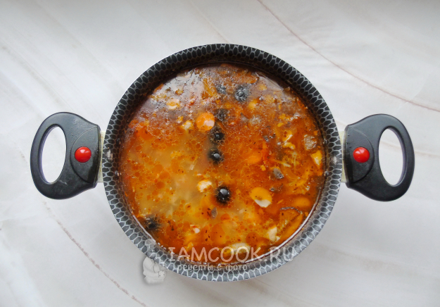 Густоту солянки регулируйте куриным бульоном по вкусу. Добавьте соль, перец и лавровый лист.