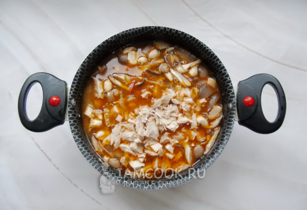 Варите суп 10-15 минут. В конце добавьте отварную курицу.