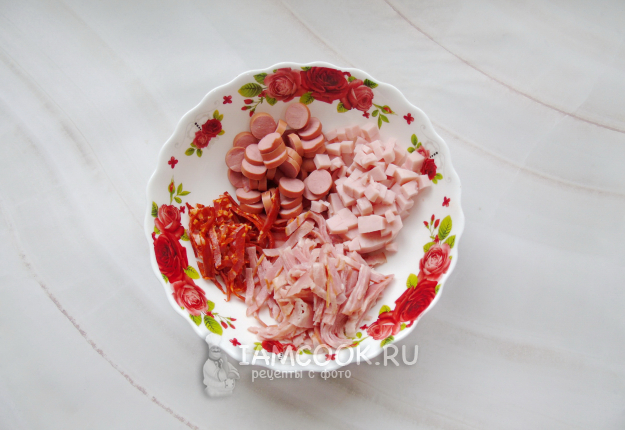 Тем временем нарежьте все колбасные изделия. Берите их по вкусу.