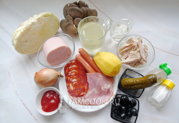 Возьмите все ингредиенты для приготовления сборной мясной солянки с капустой, грибами и картошкой. Они перед вами - на фото.