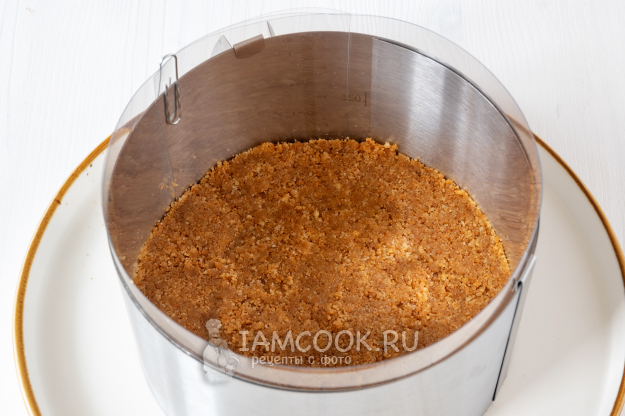 Всыпьте всё печенье с маслом в форму и утрамбуйте с помощью чего-то плоского. У меня это рюмочка.