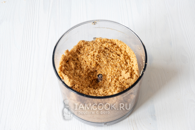 Первым делом измельчите печенье в блендере или с помощью скалки в пакете до состояния крошки.