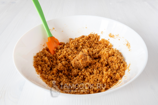 Влейте к печенью растопленное сливочное масло и хорошо размешайте массу. Когда набираете часть массы в руку и сжимаете её, она должна держать форму, а не рассыпаться.