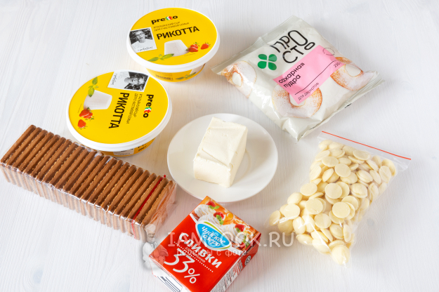Для приготовления чизкейка с рикоттой без выпечки без желатина (с печеньем) соберите необходимые компоненты по списку.