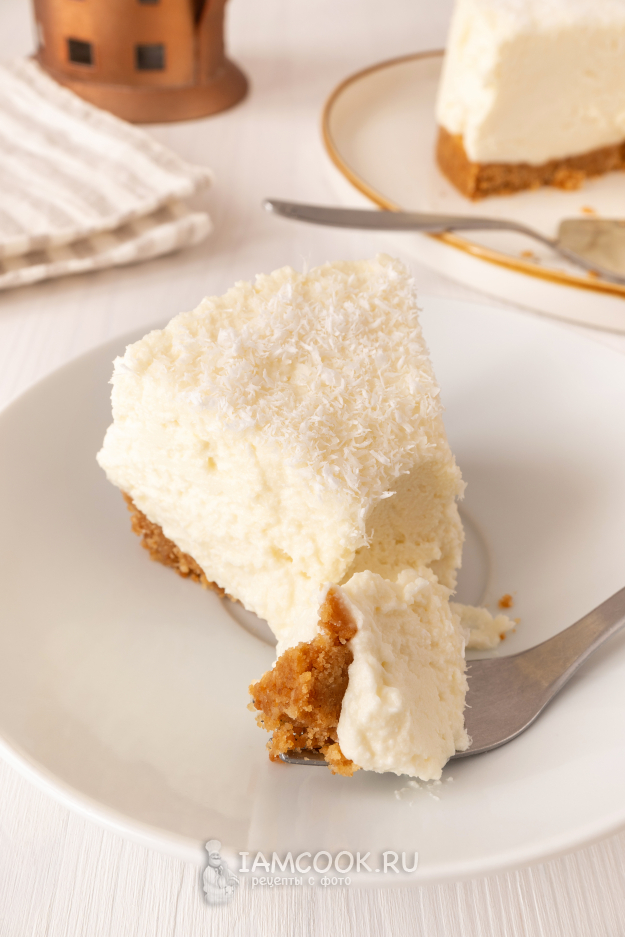 Выложите воздушную сливочную массу на основу из печенья и разровняйте. Сверху при желании украсьте кокосовой стружкой. После чего поставьте чизкейк в холодильник на 8-12 часов (на ночь). Но как я писала выше, самые нетерпеливые могут начинать резать чизкейк уже через 2 часа. Однако лучше всё же подождать, так он будет более стабильным.