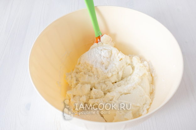 Соедините в миске рикотту с сахарной пудрой и перемешайте.