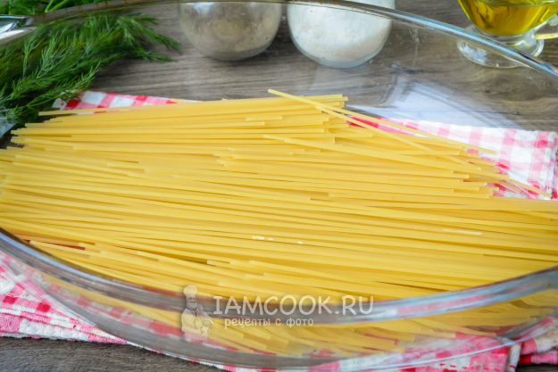 Смажьте форму для запекания любым растительным маслом, можете использовать оливковое. Выложите спагетти, желательно твердых сортов - они не слипнутся после запекания.
