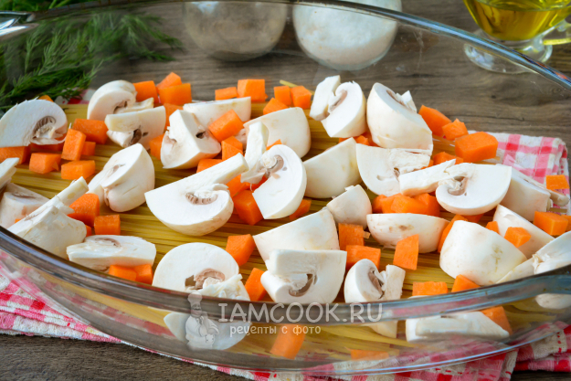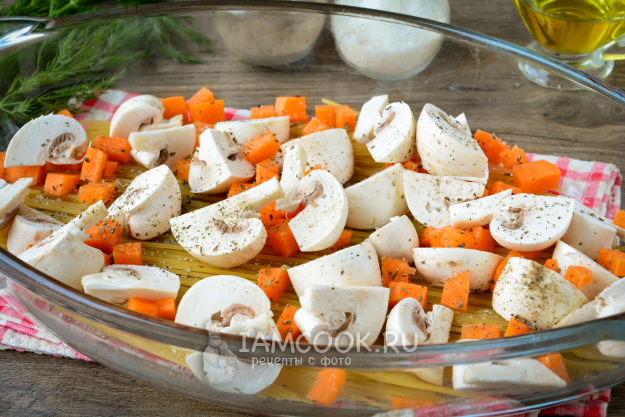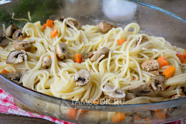 К спагетти добавьте морковь и грибы, равномерно выложите их на спагетти.