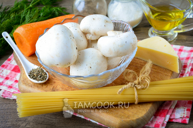 Перед вами все необходимые ингредиенты для приготовления спагетти с грибами в духовке.