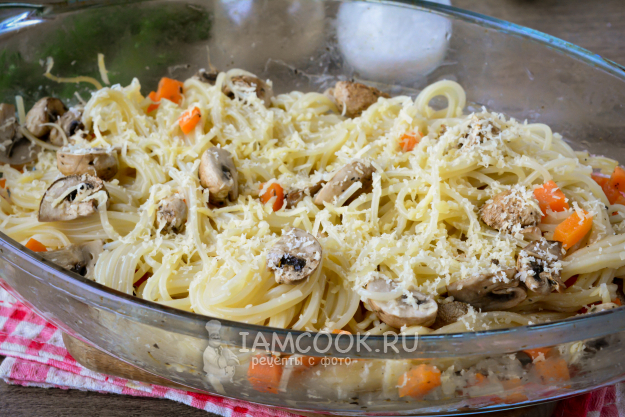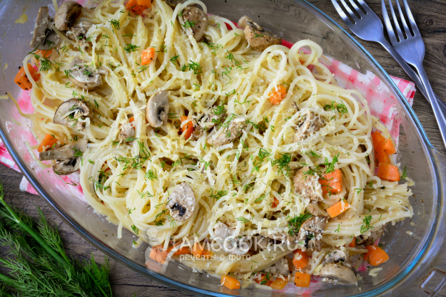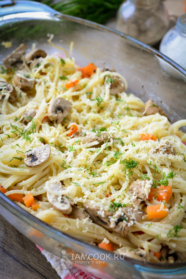 Запекайте спагетти с грибами в духовке 25 минут, чтобы впиталась вся жидкость, перемешайте. Температура духовки - 190-200°С.