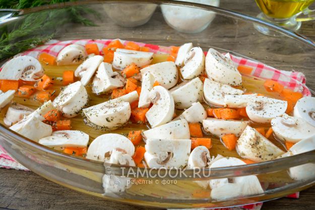 Шампиньоны промойте и нарежьте крупными кусочками. Морковь почистите и нарежьте средними кубиками - она придаст блюду дополнительный вкус и яркий цвет.