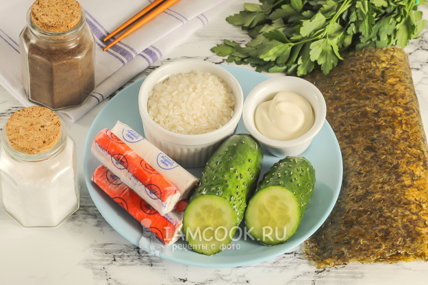 Продукты для приготовления онигири с крабовыми палочками - перед вами!