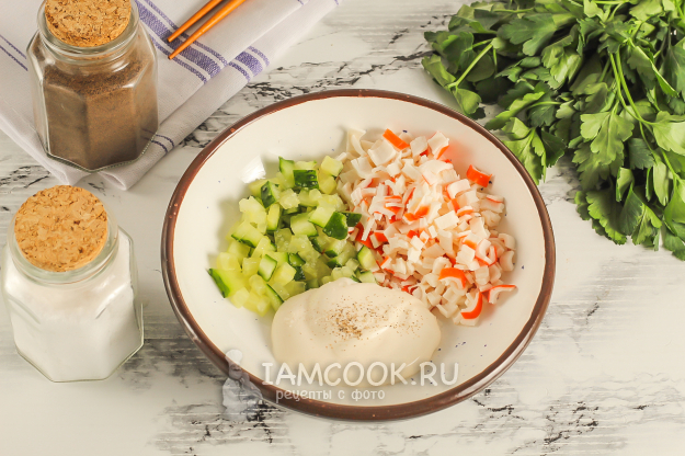 Промойте огурец в воде и срежьте хвостики. Нарежьте его и крабовые палочки мелкими кубиками. Выложите в глубокую емкость и перемешайте вместе с плавленым сыром, солью и молотым черным перцем. По желанию можете добавить различную пряную зелень: кинзу, зеленый лук, петрушку и т.д.